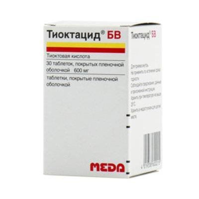 Таблетки покрытые оболочкой 600мг, активное вещество тиоктовая кислота. В упаковке 30 шт.