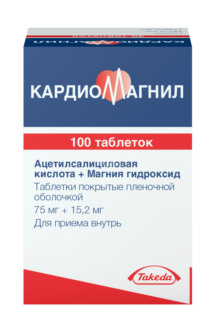 Кардиомагнил - таблетки, покрытые пленочной оболочкой, одна содержит ацетилсалициловую кислоту 75 мг, магния гидроксид 15.2 мг. Во флаконах по 100 шт.