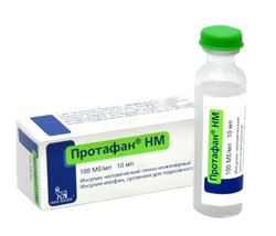 ИНСУЛИН ПРОТАФАН НМ - 1 мл суспензии для инъекций содержит биосинтетического инсулина человеческого 100 МЕ, по 10 мл в стеклянных флаконах, в коробке 1 флакон.