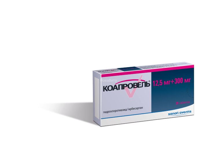 Коапровель - таблетки, одна содержит ирбесартан 300 мг, гидрохлоротиазид 12,5 мг, вспомогательные вещества, В упаковке 28 шт.