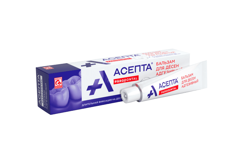 Адгезивная основа бальзама, состоящая из пектина и карбоксиметилцеллюлозы, при нанесении на слизистую оболочку набухает и фиксируется на срок до 30 минут. Таким образом, активные противомикробные компоненты средства действуют локально и длительно: в месте воспаления в полости рта. В результате адгезивный бальзам «Асепта» действует существенно эффективнее традиционных гелей для дёсен, быстро покидающих полость рта под действием секреторной функции.