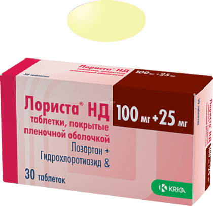 Лориста НД таблетки, покрытые оболочкой, желтого цвета, овальные, одна содержит содержит лозартан калия 100 мг, гидрохлоротиазида 25 мг. В упаковке 30 шт.