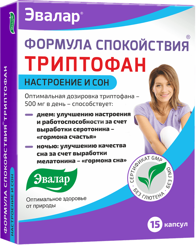 «Формула спокойствия Триптофан» днем поможет в любой ситуации сохранять спокойствие и безмятежность, а ночью – легко заснуть и полноценно выспаться. В ее составе – комплекс L-триптофана и витаминов группы В, необходимый для синтеза «гормона счастья» - серотонина, из которого в темное время суток вырабатывается «гормон сна» - мелатонин. «Формула спокойствия Триптофан», способствуя синтезу в организме серотонина и мелатонина, действует универсально. Днем: